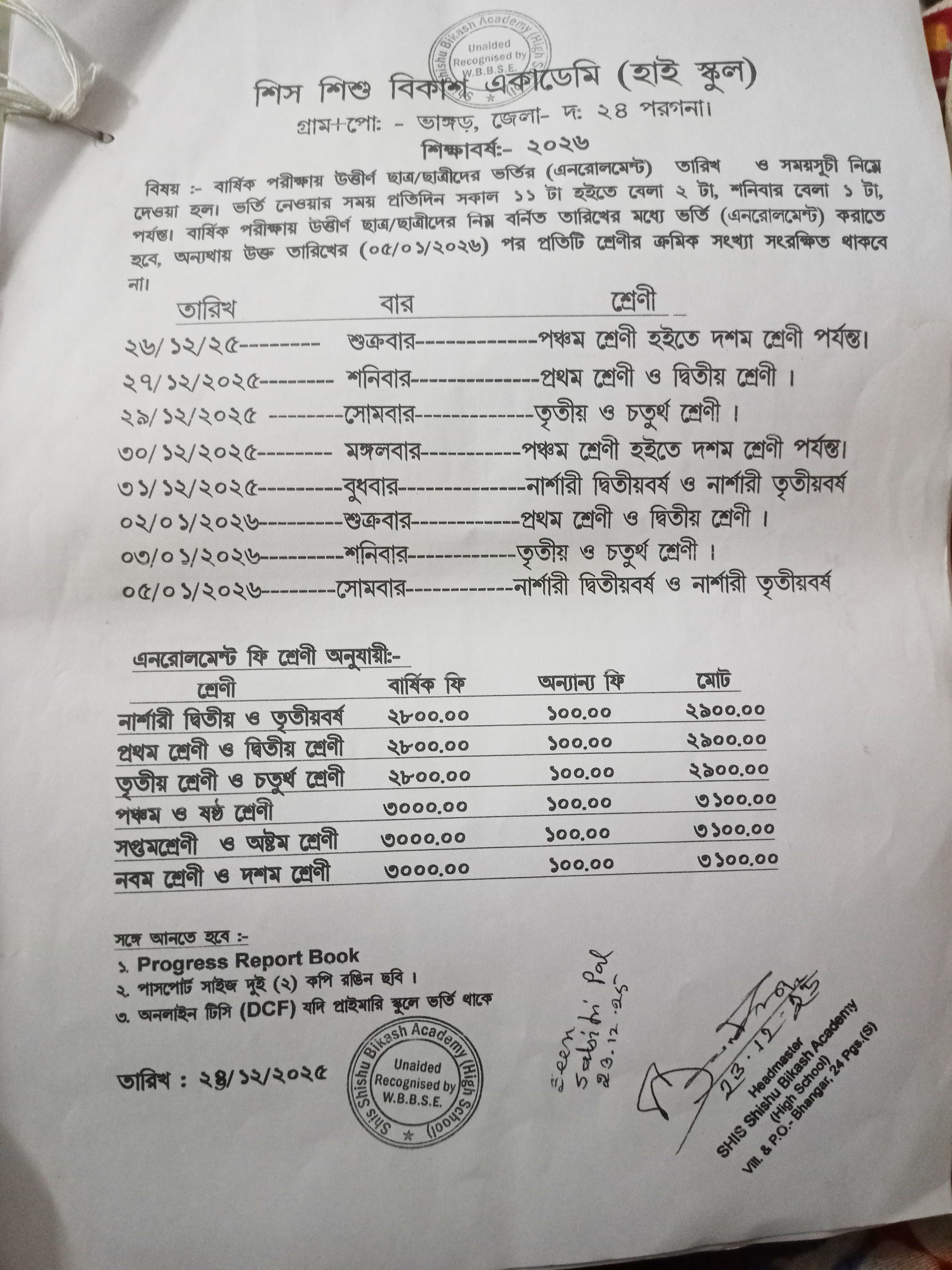 Dates of New Admission: 18/12/2025 to 20/12/2025 Time: 11:30 a.m. to 1:30 p.m.